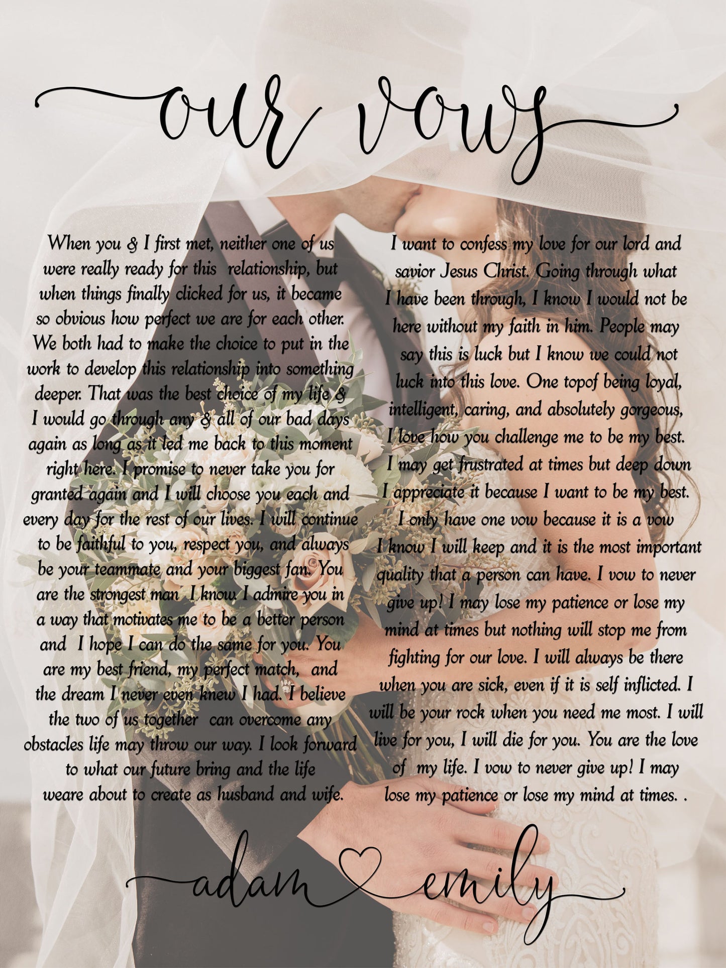 This is a perfect way to remember your wedding vows! Use your own photo and vows to create a custom canvas print product that comes ready to hang on the wall.